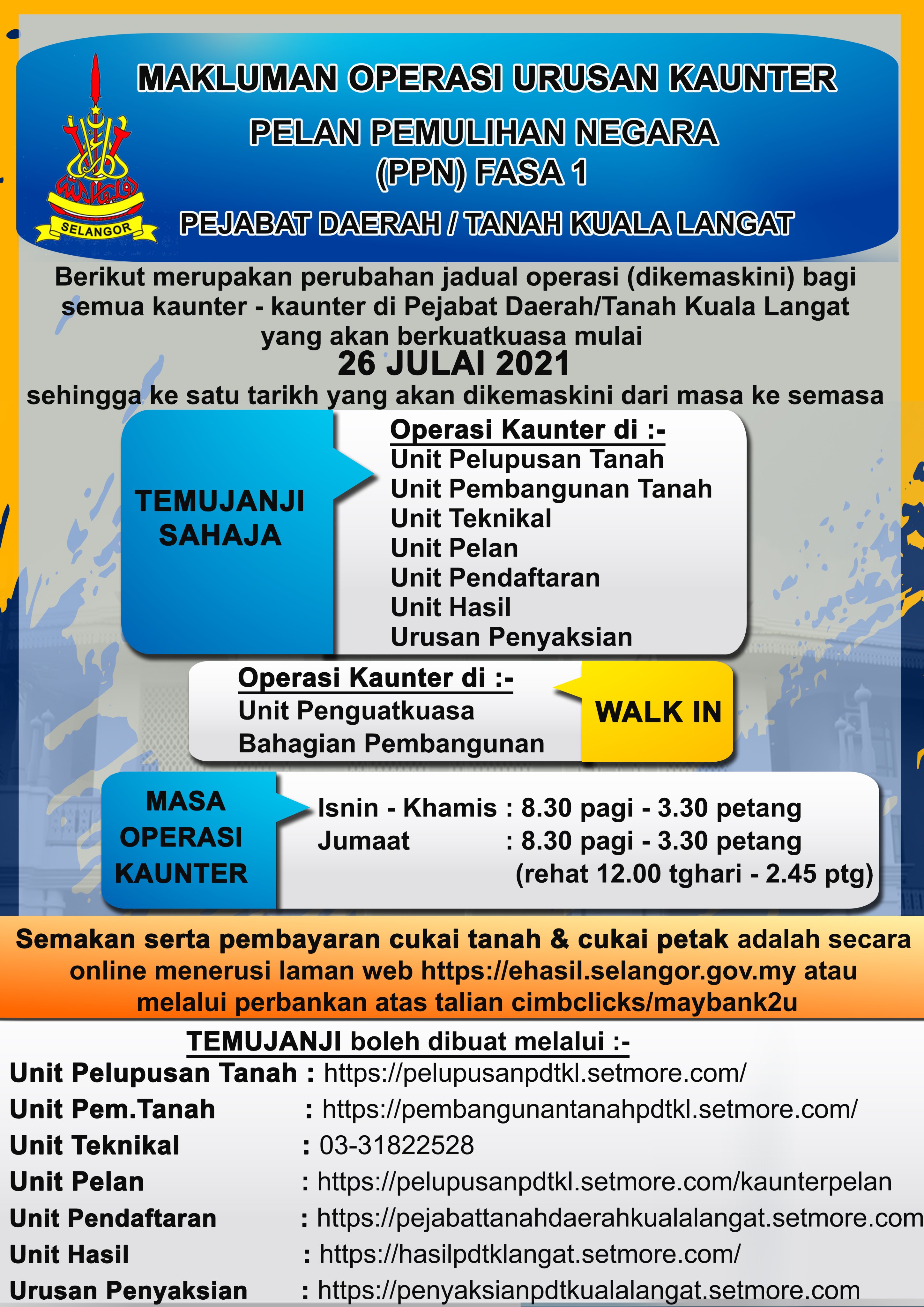 Pdt Kuala Langat Twitter पर Berikut Merupakan Perubahan Jadual Operasi Dikemaskini Bagi Semua Kaunter Kaunter Di Pejabat Daerah Tanah Kuala Langat Yang Akan Berkuatkuasa Mulai 26 Julai 2021 Sehingga Ke Satu Tarikh